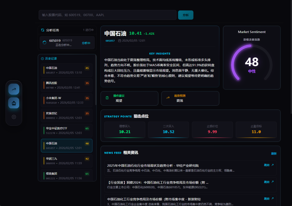 – 流式进度反馈:行情获取 → 技术分析 → 新闻搜索 → 生成结论